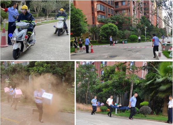 集合完毕后,总指挥下达演习指令。接到火警指令后的警戒组,分三辆摩托车疾驰抵达各管制路口,对消防通道设置警戒线;灭火组成员全副武装,带上消防斧、消防钳、救生绳等装备直扑火场;疏散组在楼道出口等位置引导该楼道的业主从最近的安全出口疏散出去;设备组报告,已到达消防监控室、附近室外消防栓及该栋配电房等位置,所有设备设施正常。