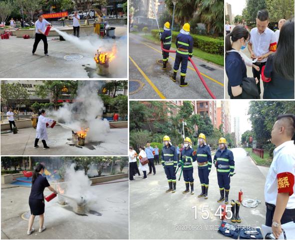 随后,救火组在小区北面消防通道进行了抛接水带、喷水灭火的演练;各小组成员对准备的二大火盆进行了干粉灭火器的操作演练。